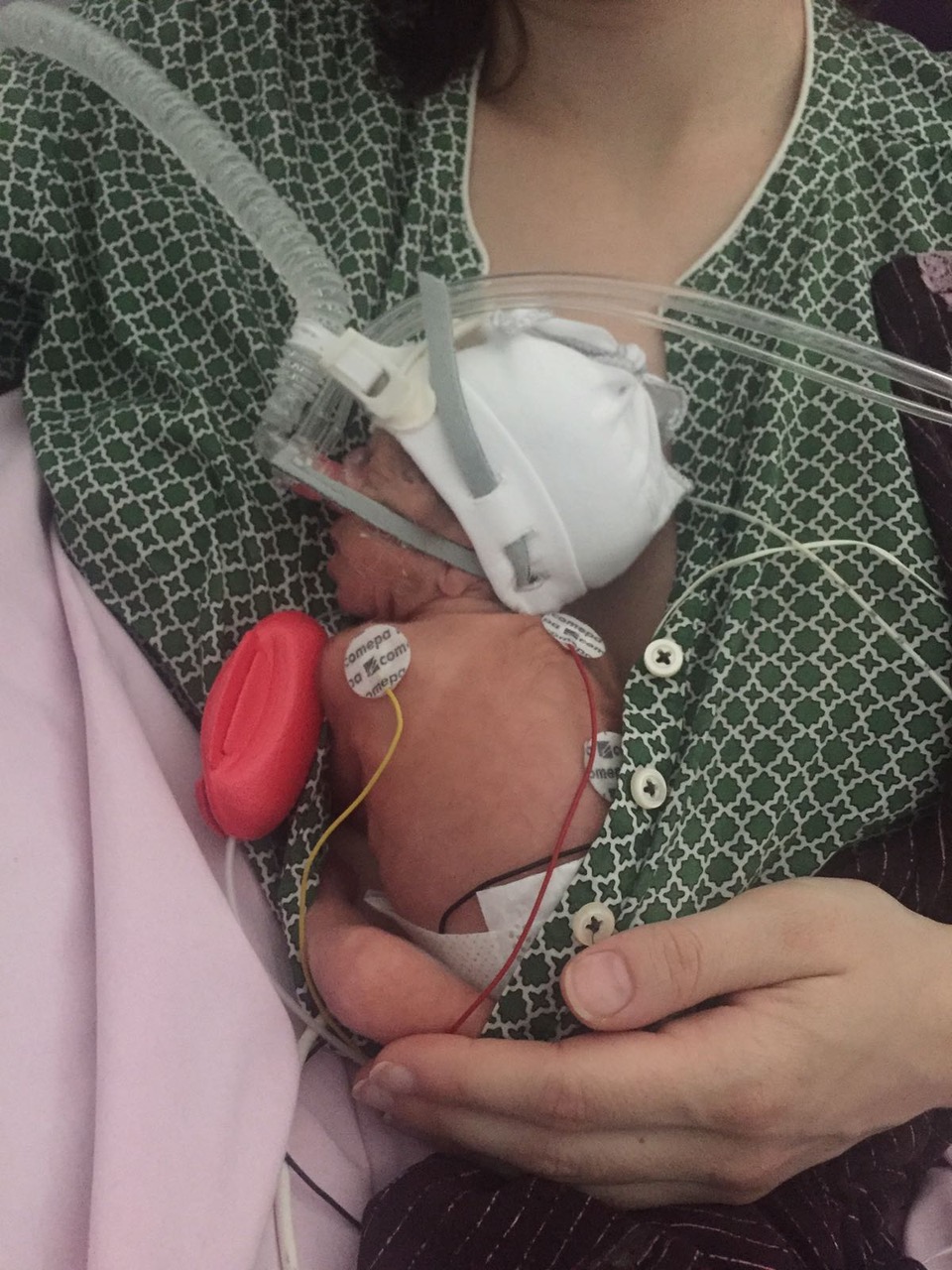 Il était dans un incubateur, intubé, il avait un cathéter central pour recevoir la nourriture chimique, une sonde nasogastrique, des électrodes, des patchs… Bref, il était branché de partout avec des bips bips au début très stressants. A peine une machine sonnait qu’on se demandait si quelque chose de grave était en train d’arriver alors que cela pouvait être insignifiant.
